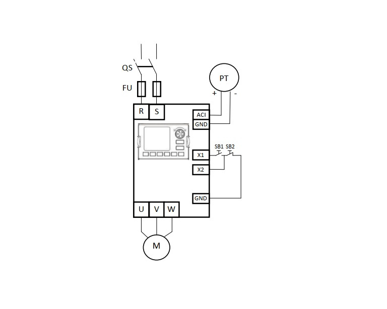 Управление приводом насоса с использованием встроенной функции ПИД регулирования. Дистанционный ПУСК, СТОП при помощи кнопок. Стабилизация давления с использованием датчика 4-20 мА.