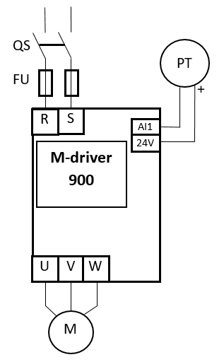 Для данной задачи мы рекомендуем использовать частотные преобразователи M-driver серии 900G, т.к. они имеют встроенный блок питания 24 VDC c максимальным выходным током до 200 мА. Также в данной серии частотных преобразователей на панель можно выводить до трех параметром одновременно: желаемое давление в системе (в бар), реальное давление в системе (в бар) и третью величину, которую выбирает пользователь через параметр F6-02.