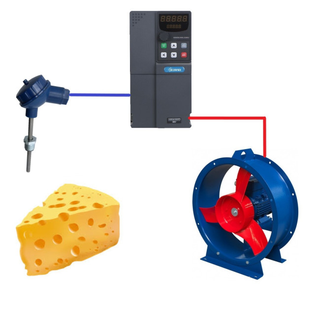 Интересную задачу по автоматизации производства сыра пришлось решать нашим инженерам. Клиент хотел, чтобы частотный преобразователь управлял скорость вращения вентилятора охлаждения в зависимости от температуры.