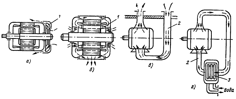 Системы охлаждения электрических двигателей весьма разнообразны (рис.). Различают машины с естественным и искусственным охлаждением.