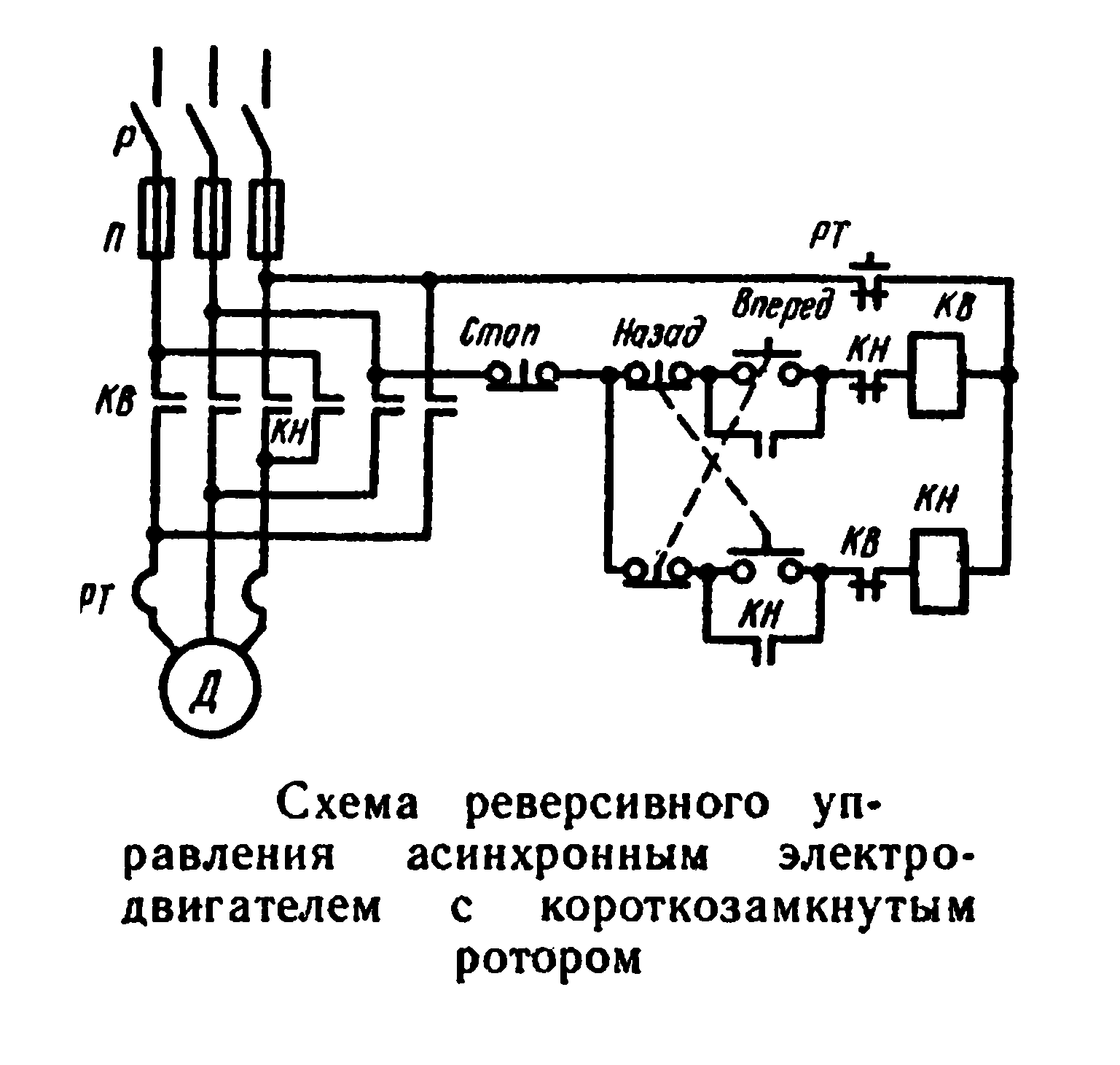 Благодаря наличию в каждой кнопке размыкающих контактов исключается возможность одновременного включения пускателей КВ и КН, которое привело бы к короткому замыканию. Однако на практике такую блокировочную связь считают недостаточной ввиду того, что главные контакты контакторов могут замкнуться вследствие приваривания. Поэтому электрическую блокировку дополняют механической: специальное механическое приспособление исключает возможность одновременного включения двух пускателей. Простой и надежной блокировкой от одновременного включения является, как указано на схеме, включение в цепь катушки «Вперед», размыкающих блок-контактов пускателя «Назад», и наоборот. Если двигатель вращается вперед и необходимо изменить направление вращения, нажимают кнопку «Назад», при этом контакты кнопки «Назад» размыкают цепь питания катушки КВ — пускатель КВ отпадает и отключает двигатель, одновременно замыкаются его контакты в цепи катушки КН, пускатель КН срабатывает и двигатель включается в обратном направлении. Для защиты двигателя установлены тепловые реле РТ.